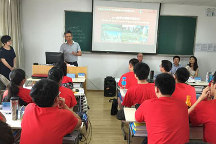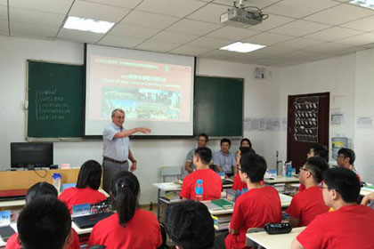 同学们身着统一的北卡班服,整齐划一地坐在下面,满怀期待地迎接前一天刚从美国芝加哥飞来的北卡大学Thomas教授。*次前来亚洲地区的 Thomas 教授现任北卡罗来纳大学数学系的教授,他将在本学期第7周和第21周份为北卡班级学生进行高等数学面对面的授课,将美国高水平大学的学分课程带到中国。